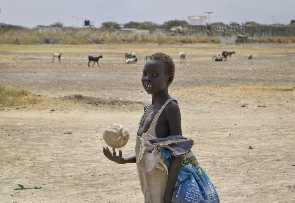 Walking along the gravel path in Bentiu's UN site, two boys playfully jostle each other, struggling in broken English to convey their feelings about the future.
