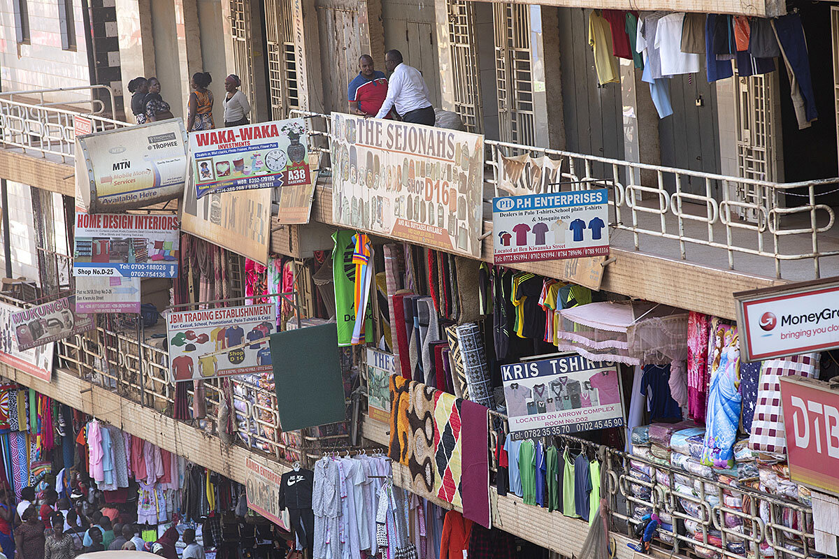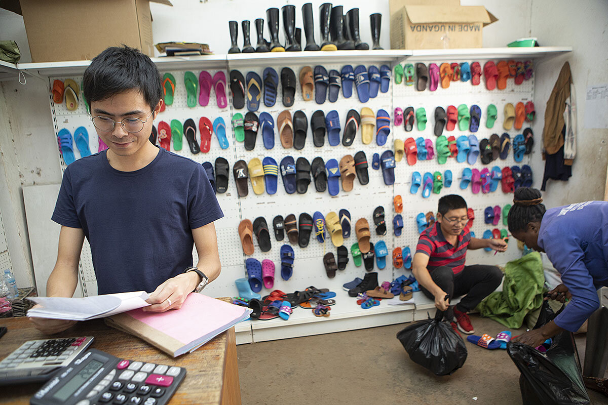 Wilson Street, where Ms. Han works, is lined by Chinese shoe shops selling imported or locally made sandals and sneakers by the truck load, literally. Just up the street, Wang Yuxin, spectacles perched on his nose, is busy writing out invoices, receipts, and orders while a colleague behind the counter counts thick wads of 50,000 shilling notes.