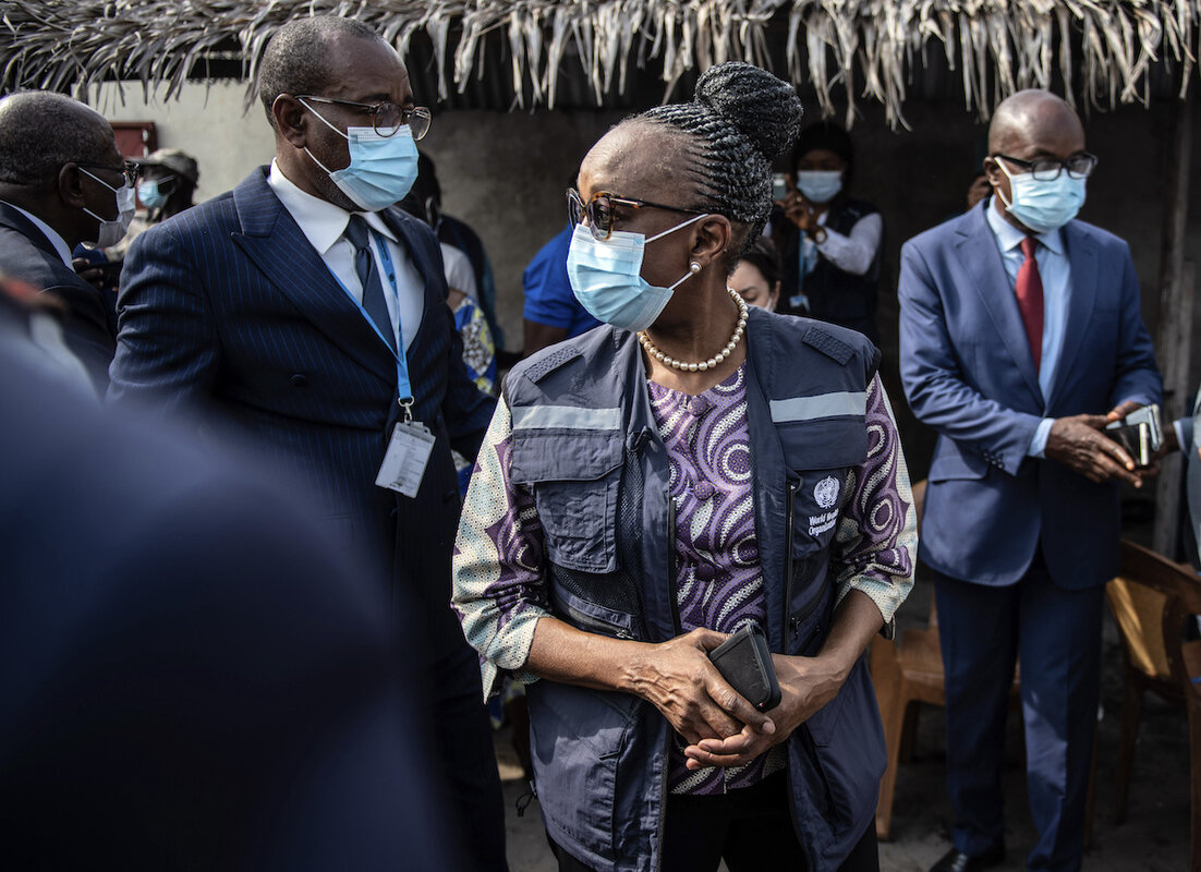 To this end, Dr. Moeti tries to get out into the field monthly. She鈥檚 frequently joined by government officials and the convoy can attract a crowd 鈥 as with a recent trip to the dense Ouenze neighborhood of Brazzaville. In a small yard outside a health center, Dr. Moeti, the health minister, mayor, and others listened to biochemistry student Arnie Mayeyenda explain COVID-19 and vaccinations to residents.