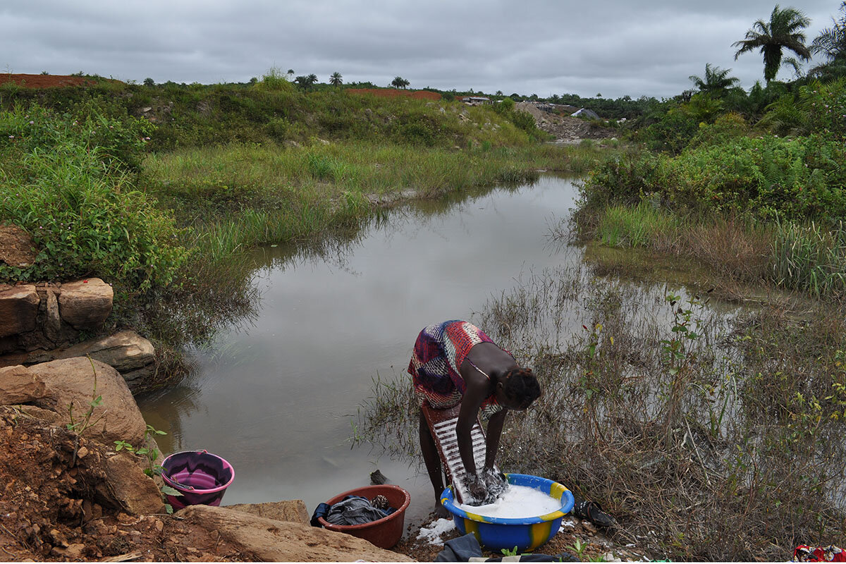 Machinery belonging to the聽Afro-Asia Mining Corp., a Chinese firm, rumbles in the distance. The remnant of a stream, polluted and diverted by the industrial operations, idles underneath a small wooden bridge.聽