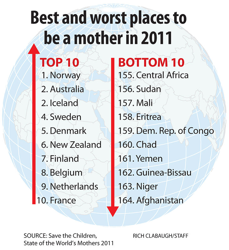 Just in time for Mother鈥檚 Day, the nongovernmental organization Save the Children has released its annual that ranks conditions for mothers across the globe. (Norway is first, Afghanistan is last, and the United States is 31st, in case you were wondering.)