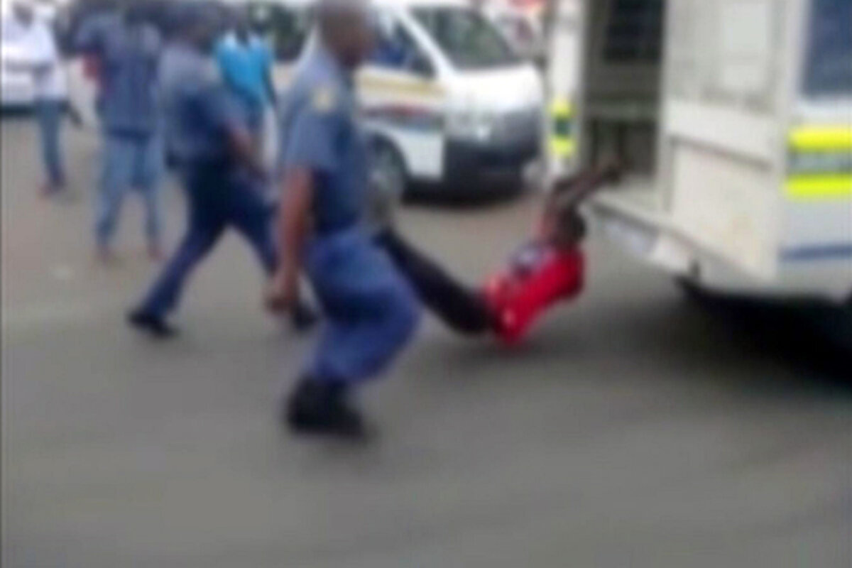 Shaky cellphone camera footage shows a man in a red shirt lying immobile behind a South African police van, his arms bound to the fender. A small group of police officers cluster around him as onlookers scream out to the officers to let him go.