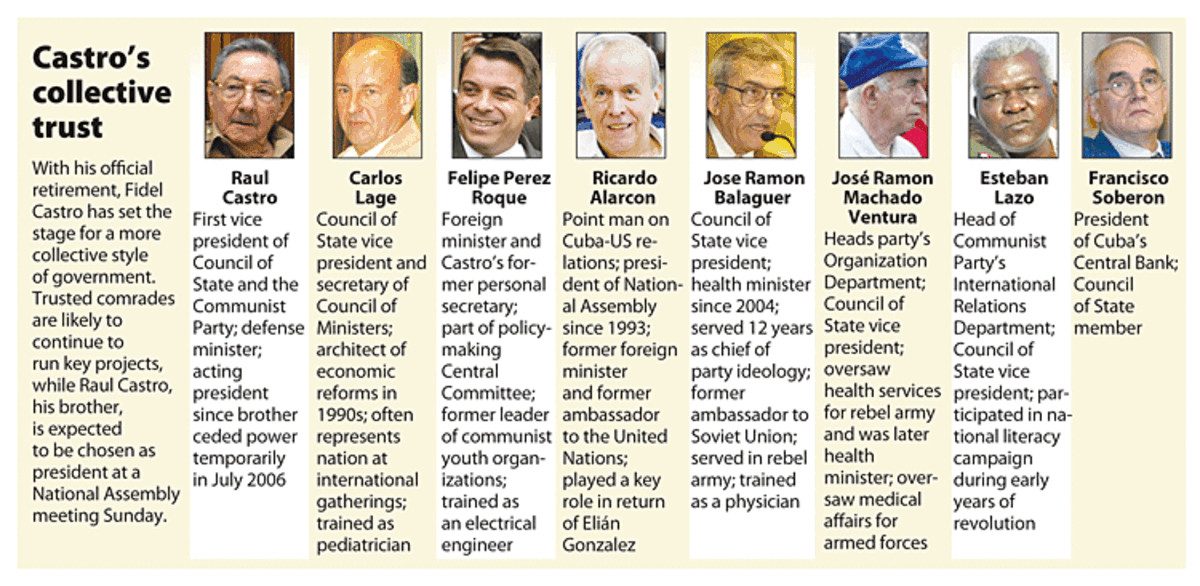 Castro's resignation is expected to make way for the permanent presidency of his brother. But other leaders could fill the spot or at least rise in the ranks of power. They include Carlos Lage, the council's vice president, or Ricardo Alarc贸n, the president of Cuba's National Assembly. In any case, Mr. Peters says that a form of collective leadership will likely emerge, no matter who carries the title.