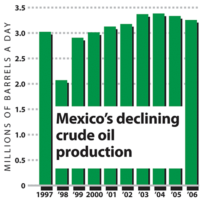 Mexico's crude production has fallen since 2004, a record year with 3.38 million barrels per day (b.p.d), according to the US Department of Energy. Production fell to 3.25 million in 2006, and the DOE predicts that it will decline by another 130,000 b.p.d in 2008 and 110,000 b.p.d in 2009. The decline parallels dramatically depleting reserves at Cantarell, which for 30 years was Mexico's biggest source of oil. At the same time, the number of Mexico's proven reserves fell from 49.3 billion barrels in 1986 to 12.4 billion last year.