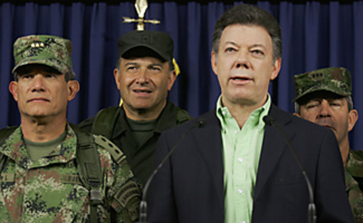 Colombia's Defense Minister Juan Manuel Santos said that, in Saturday's operation, ground troops in pursuit of the rebels were fired on from within Ecuadorian territory and aircraft were called in to bomb the location from Colombian airspace.