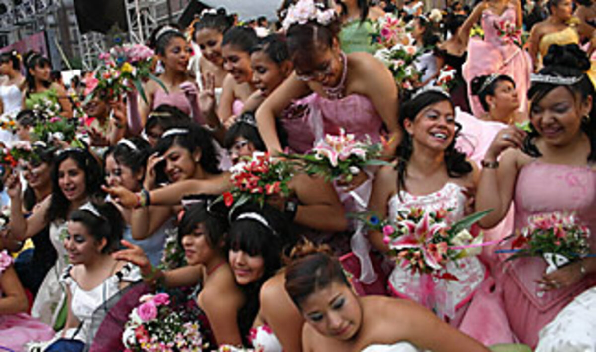 But too many Mexicans 鈥 like the 300-some here Saturday night 鈥 can't afford the rite of passage that, like weddings in the United States, has become a multimillion-dollar industry, with planners choosing everything from invitations to bands and dresses alone costing hundreds of dollars. So in 2007 Mexico City had an idea: a mass 辩耻颈苍肠别补帽别谤补, which became the world's largest on record. This year the number of participants nearly doubled.