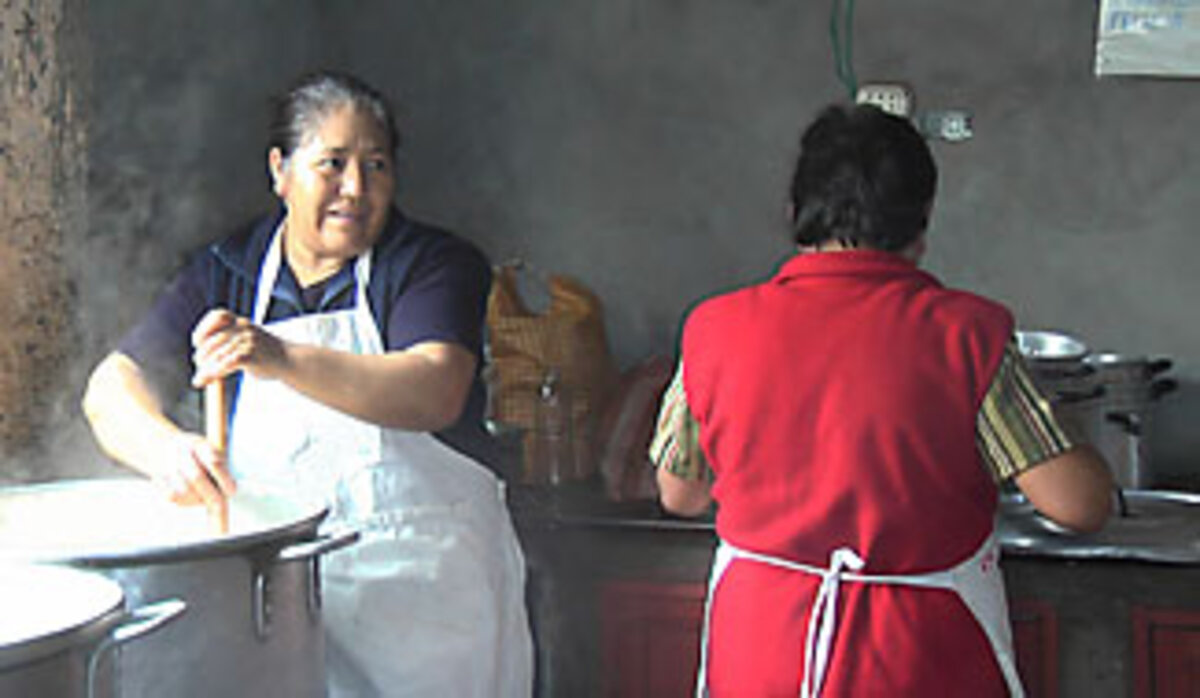 Steam rises into air thick with the scent of garlic as women prepare lunch for 120 of Peru's neediest.