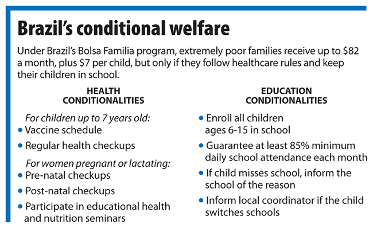 Mothers receive up to 182 reais 鈥 about $82 鈥 as long as they keep their children in school, get them vaccinated, and participate in regular health checkups.