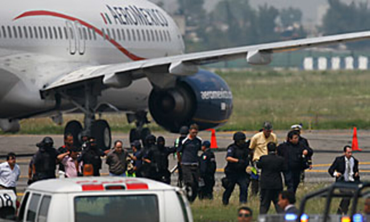 At least five suspects are in police custody. Local media had reported that they were Bolivian nationals threatening to blow up the aircraft if President Felipe Calder贸n did not speak with them.