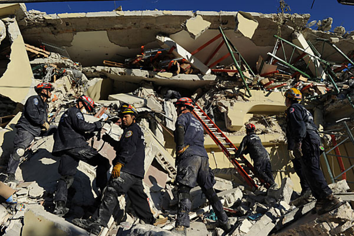 Jose Medina, a firefighter from south Florida, hoists a ladder onto what remains of El Caribe, a once-bustling supermarket that folded into itself during the quake. Pieces of concrete begin to fall around him, and two jagged slabs of concrete dangle from the remains of the roof. 鈥淎ny of this could move at any second,鈥 he says.
