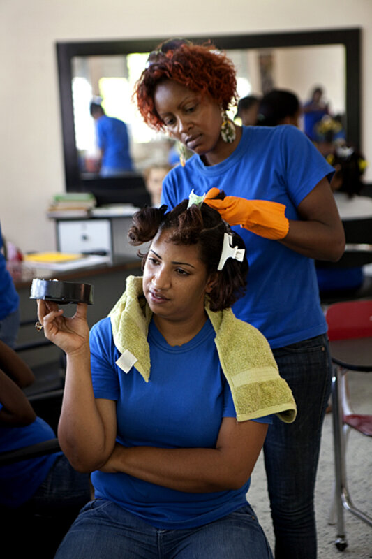 The pink-walled room is filled with the buzz of hair dryers and chatter, the women in their blue T-shirts alternately giggling and focusing intently at the beauty tasks at hand: setting curlers, painting nails, straightening a classmate's hair.