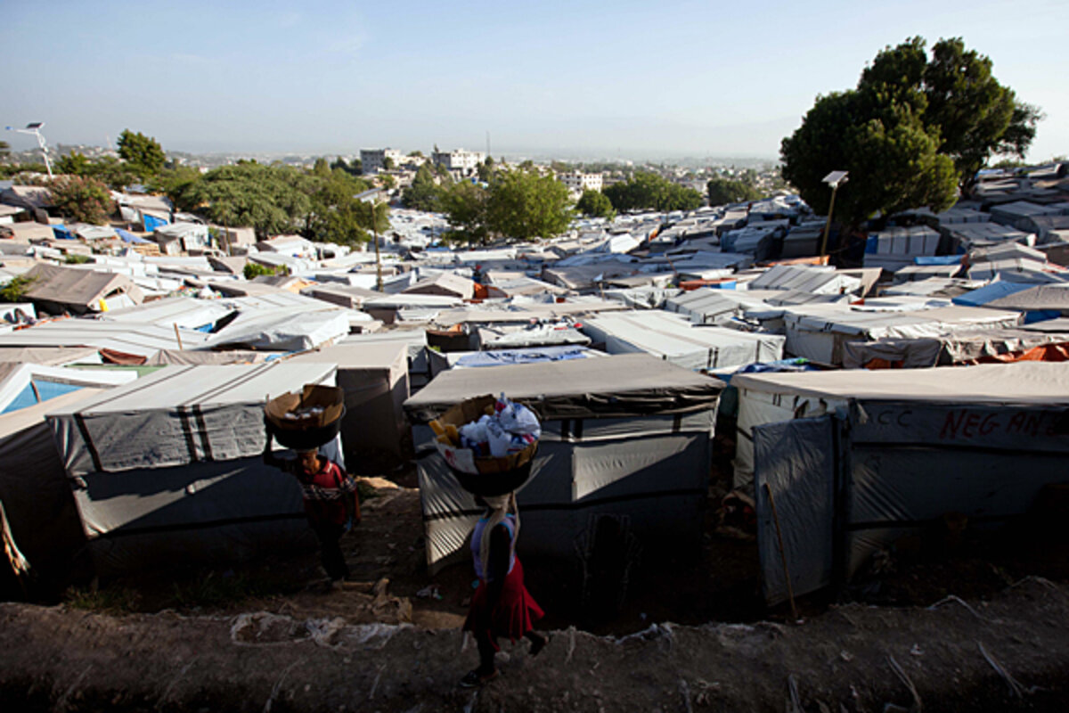 As darkness descends on a recent evening, women race to complete tasks in a tent city in the middle of Port-au-Prince where they say their only protection is sunlight and God.