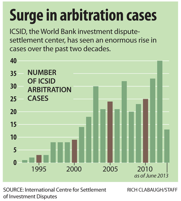 In 2000, just three cases came before the World Bank's International Centre for Settlement of Investment Disputes (ICSID) related to extractive industries such as oil, gas, and mining, according to the Institute for Policy Studies. The two decades preceding saw just seven such cases. But by March 2013, the number of such cases pending had jumped to 60 at ICSID. That made up nearly 36 percent of all pending cases, reports IPS.