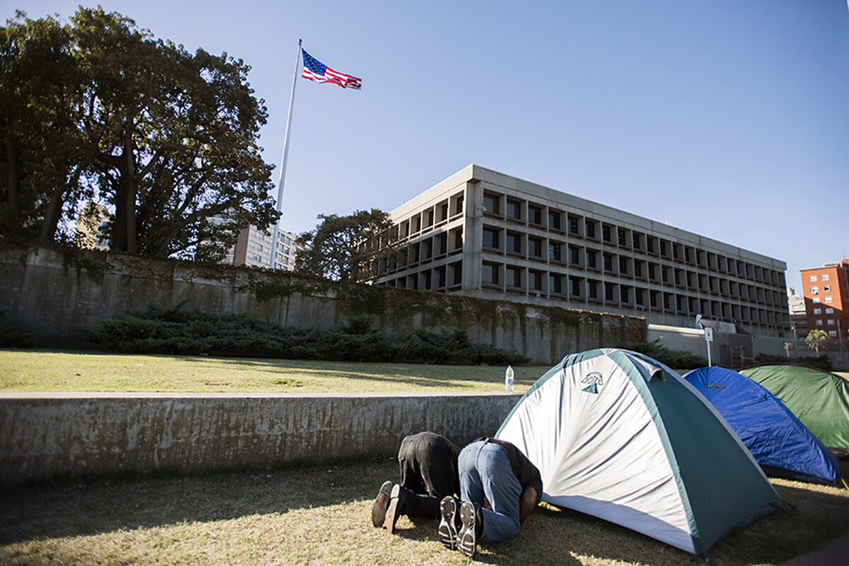 The former detainees while away the days in their tents, sitting on nearby park benches, and praying.聽