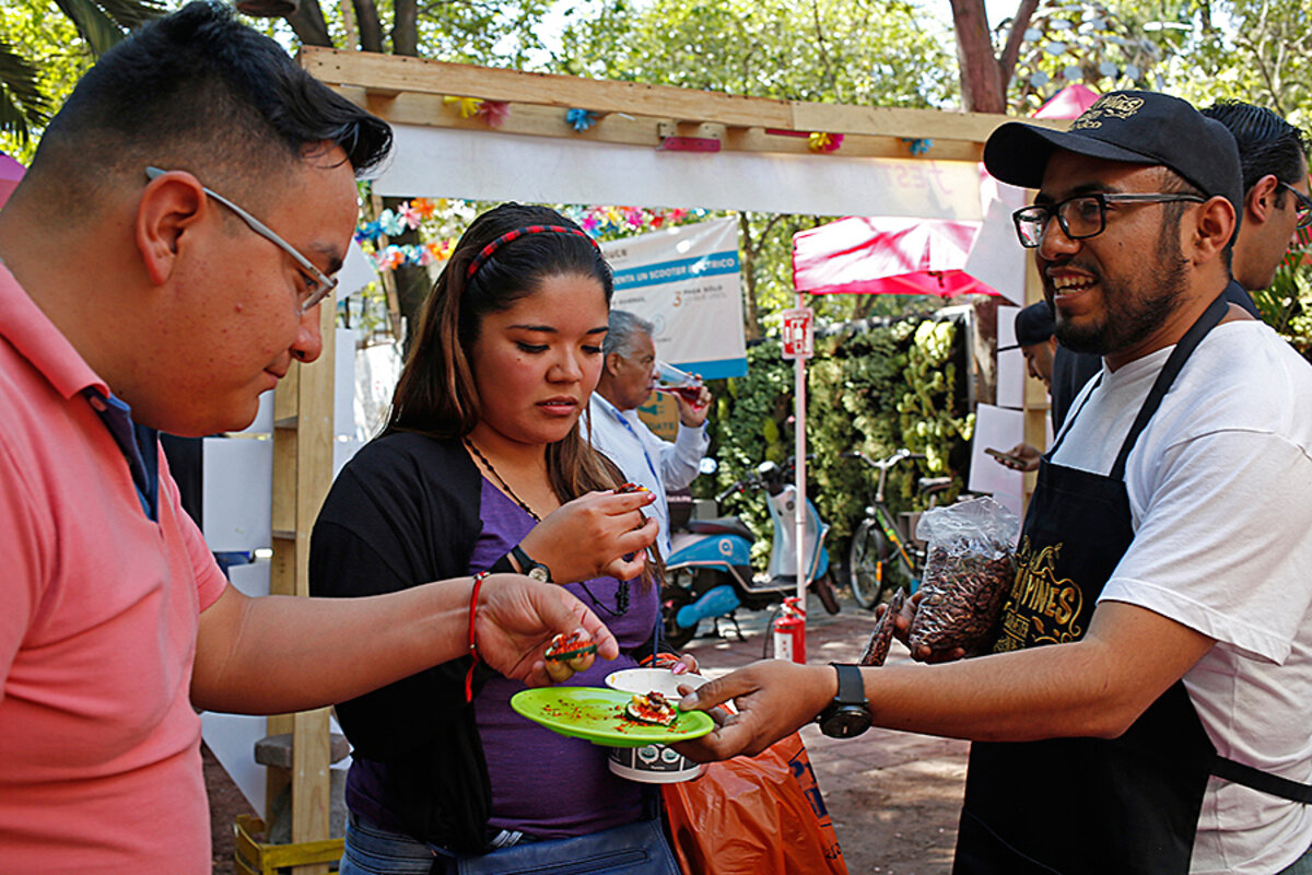 At first glance, the stalls set up in this neighborhood garden look like they could be part of any typical farmer’s market. There are the men selling artisanal chocolates, the bread maker stacking her loaves precariously high, and the couple slinging tortillas over a smoking comal, or griddle.