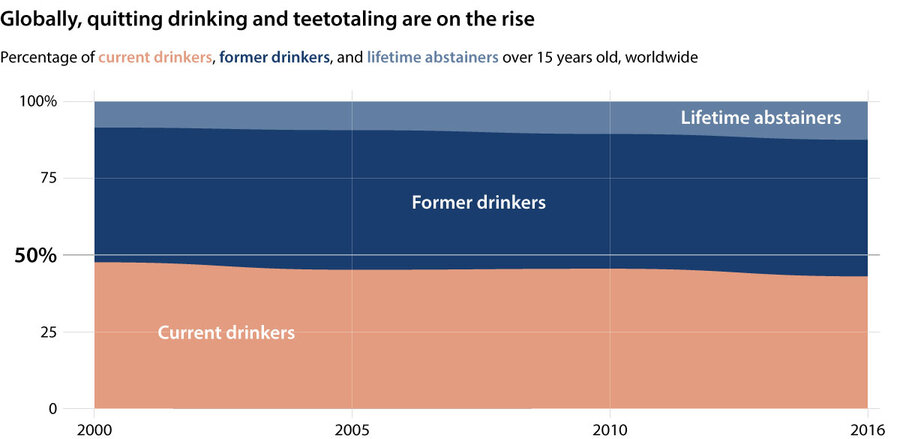 Yet mistaken assumptions persist, says the WHO's Poznyak. While alcohol is consumed worldwide, a majority abstain from drinking. In 2016, 57 percent of the population over age 15 had not consumed alcohol in the previous year. 鈥淚n spite of all the changes in marketing, etc., most people don鈥檛 drink alcohol at all,鈥 he says. 鈥淔or many countries, many populations, drinking is not the norm.鈥
