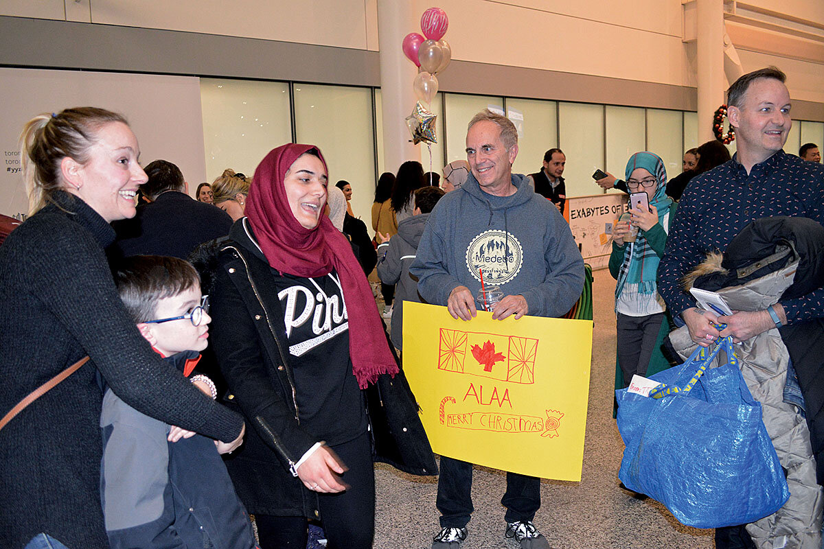 Among those waiting are Lana Delmaestro, her husband, and their young son. The youth holds a homemade poster with a maple leaf drawn in red marker and the name 鈥淎laa.鈥 They intently watch the sliding doors for a Syrian refugee they鈥檝e never met, but whom the family sponsored with a group of other Canadians.