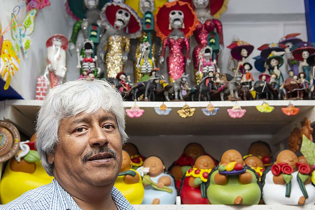 Among his bestsellers this time of year are the catrinas, or female skeleton figurines that symbolize Mexico鈥檚 D铆a de Muertos (Day of the Dead). He creates them in metal or sells them in wood, dressed in bright, elegant gowns and equally bright hats.