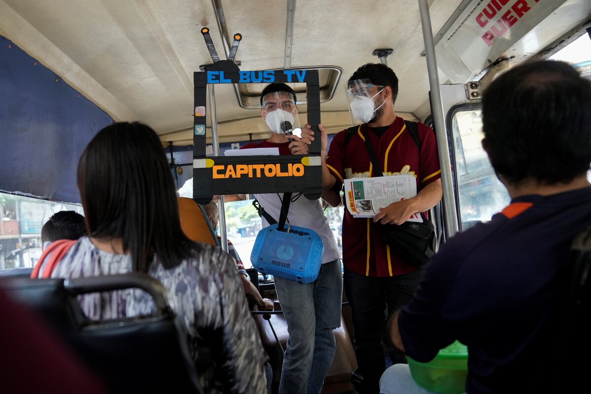 After boarding a bus in Venezuela鈥檚 capital, Juan Pablo Lares sits in front facing the passengers, turns on a microphone and speaker, and delivers the news while a colleague holds a black cardboard frame around his face to mimic a television screen.