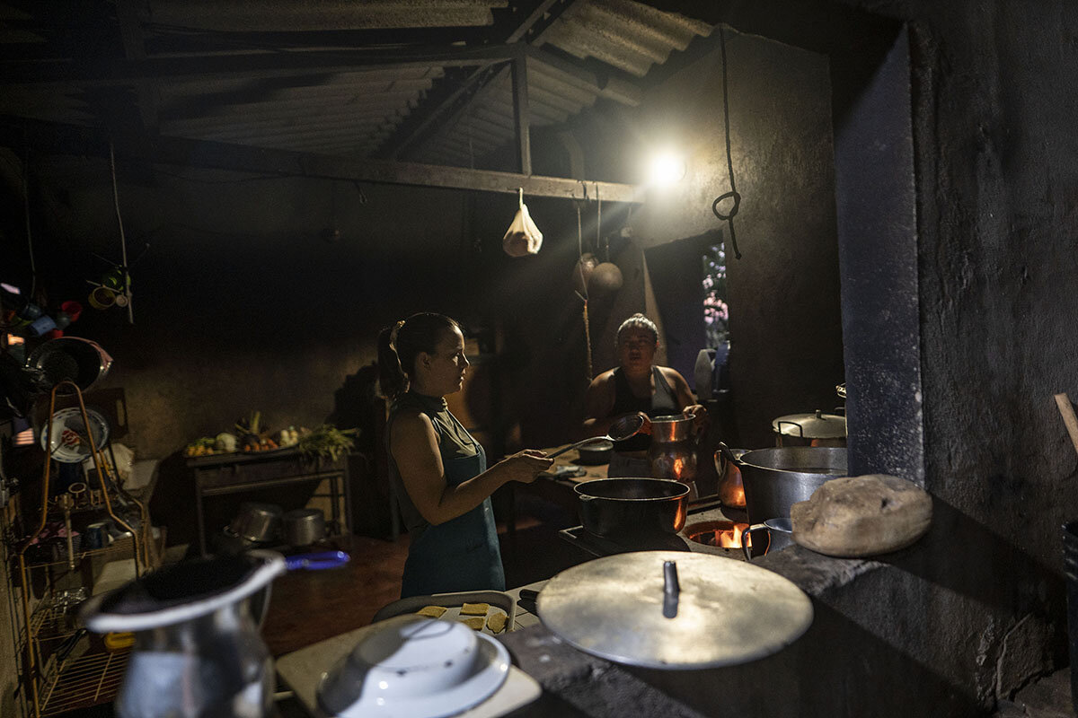 Their day began below a starry sky with the butchering of a cow for their twice-daily meals. The work lasts 15 hours daily, and