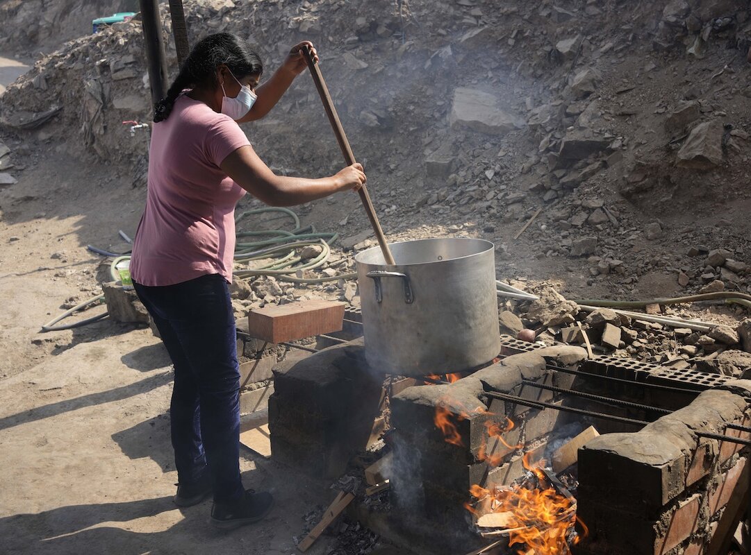 Ciudad de Gosen residents say the price of cooking gas has tripled since the start of the pandemic. Ms. Cueto and her neighbors feed the fire under their common pot with wood scraps they are given twice a month as charity from a carpenter鈥檚 shop.