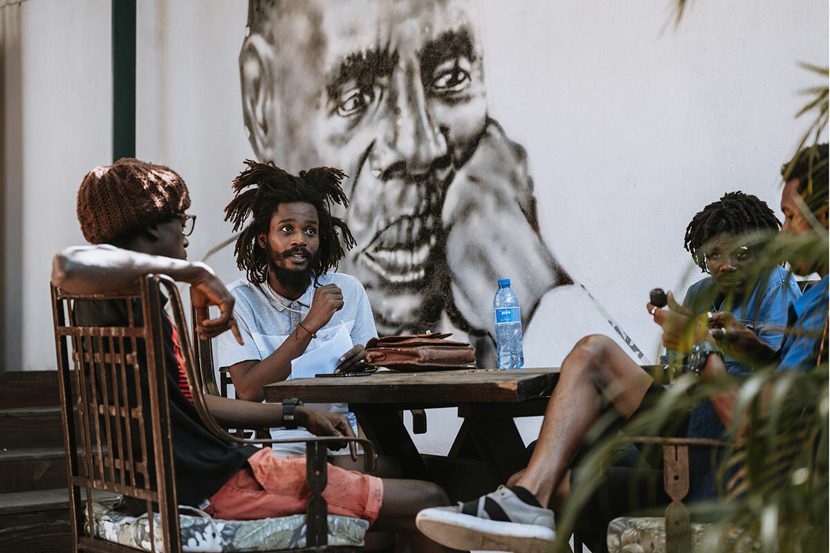 Colorful murals of well-known artists and thinkers cover the cement walls at Yanvalou, including singer Nina Simone, Haitian dancer Viviane Gauthier, and national anthropologist Jean Price-Mars.聽The audience at the opening in November makes its way from the courtyard into the restaurant, where chairs are set up facing two lecterns.