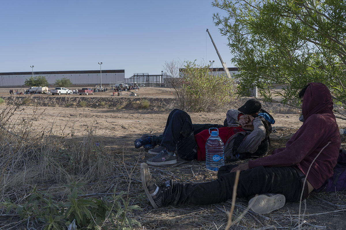 David, a Nicaraguan migrant who studied law for two years, sits with fellow travelers observing the wall at the entrance to the United States in Ciudad Ju谩rez, Mexico, April 26, 2023.