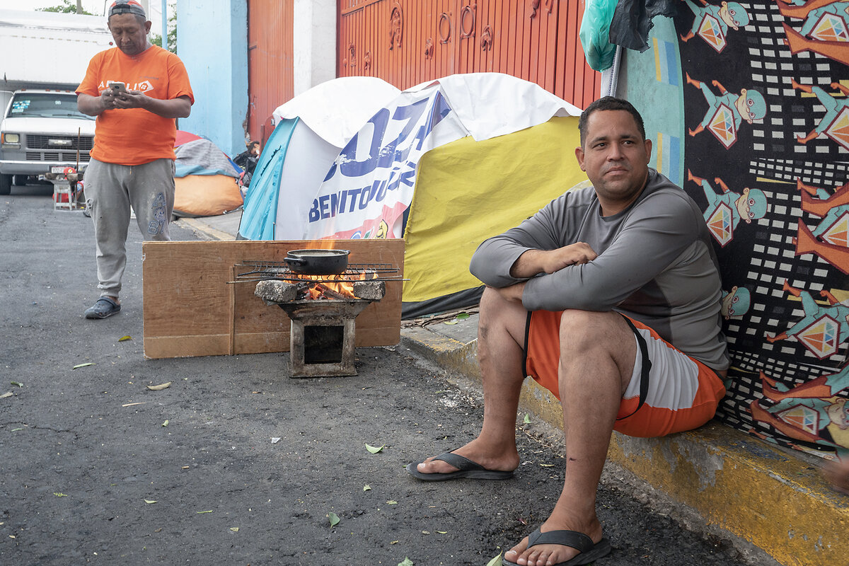 Earlier this spring, Amri Rafael Garido, a Venezuelan migrant sleeping outside the聽Arch谩ngel Rafael shelter, watches a compatriot cooking a pot of rice with noodles over a wood-fired stove. He laughs when asked about his plans: 鈥淲e just want to get to the U.S.鈥