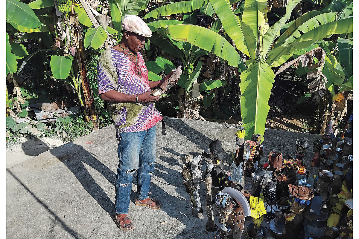 Last year, Mr. Eugène fled the city seeking safety in Port-Salut, in southern Haiti. His recent work accumulates in a yard overlooking cloud-draped mountains. The sculptures cast long, shifting shadows as the sun moves across the coastal valley. He struggles to adapt to the stillness of rural life.