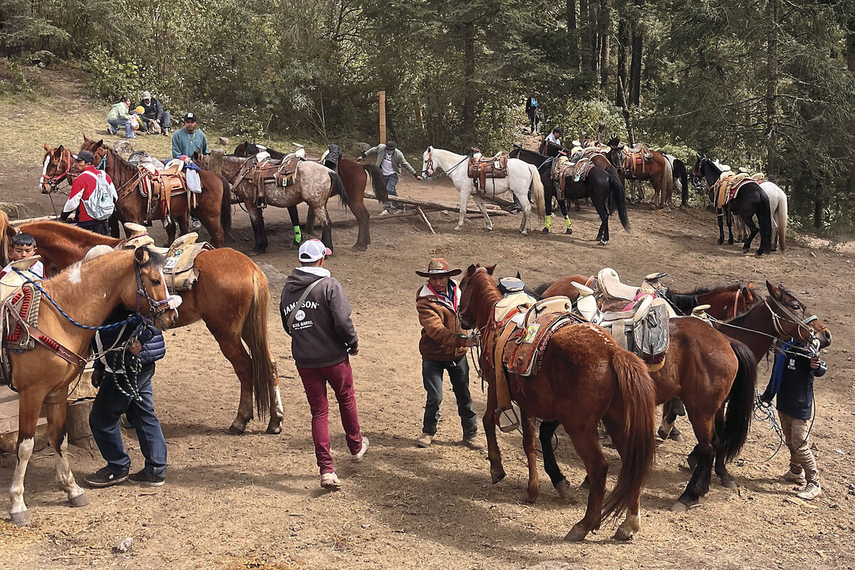 On a February afternoon, a band of horses ambles across a hillside not far from where the monarchs are gathered in the verdant Chincua sanctuary. Simon, in his early 20s and wearing a sideways baseball cap and red winter jacket, grew up in this area helping his father lead visitors up the steep forested slopes of the preserve on the family鈥檚 horse, Grillo, or Cricket. 聽