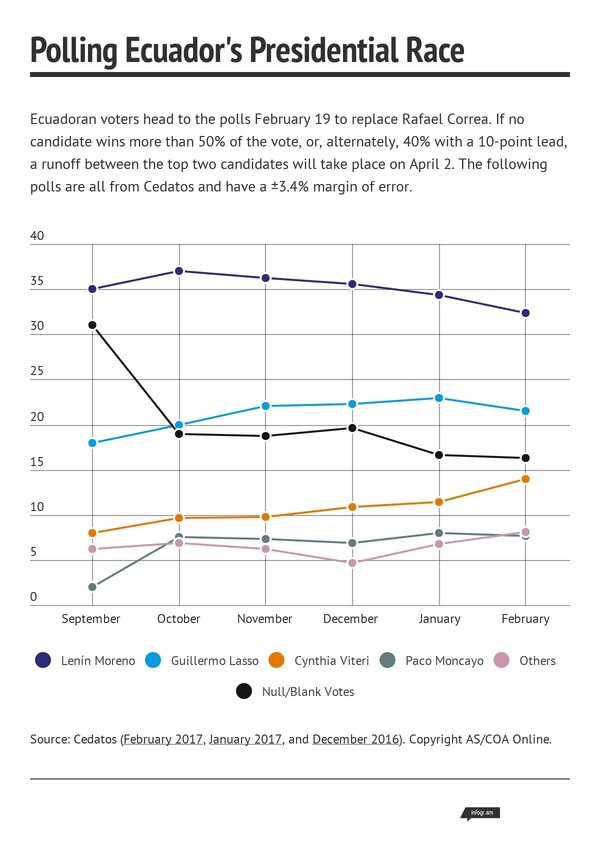 Correa鈥檚 popularity will have the most direct implications for聽Len铆n Moreno, the president鈥檚 former vice president and chosen successor on his PAIS Alliance party ticket, who currently has a healthy lead in polls but could face a tight runoff. Mr. Moreno鈥檚 running mate, Jorge Glas, is Correa鈥檚 current vice president and at the heart of a 聽involving the state oil company and alleged bribes from the Brazilian firm Odebrecht.聽Still, Moreno has the full backing of the political machine and, if he鈥檚 able to pick up more support after the first round, he could be hard to beat. Moreno has promised to continue many of Correa鈥檚 projects, and his platform focuses on health, education, jobs, social security, and developing Ecuador as an聽听诲别蝉迟颈苍补迟颈辞苍.