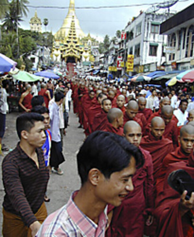 Meanwhile, the peaceful antigovernment marches in September, which began here, in Pakokku, a dusty town on the banks of the Irrawaddy River, and spread across the country, were effectively and brutally crushed by the military regime. At least 30 people were killed in those protests, according to United Nations estimates, and thousands were detained, including monks. Other monks were "de-robed" or chased away from monasteries back to their villages. In Pakokku, about a quarter of the monks have yet to return.