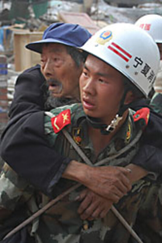 Others were too infirm to be able to make the journey on their own. As evening turned to night on Friday, soldiers and firemen arrived here from distant villages with aged peasant farmers tied to their backs or sitting on makeshift palanquins fashioned from wooden chairs lashed to poles that the young men carried on their shoulders.