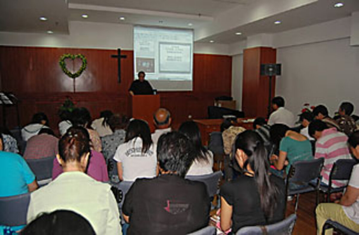 The church meets in a hotel conference room that seats about 200 people, with hymn verses projected onto a screen up front and Bibles available on a table in the back. The pastor is one of a half-dozen appointed by the state who take turns preaching here each Sunday.