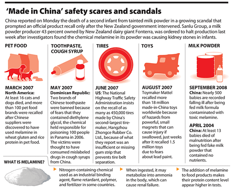 A leading Chinese dairy company, Sanlu, admitted last week that its baby formula manufactured earlier this year was tainted by the chemical melamine. Doctors in several Chinese provinces have found more than 1,200 babies who drank the formula suffering from kidney stones and renal failure. Two babies have died as a result since May, officials say, warning that the number of cases could rise sharply.