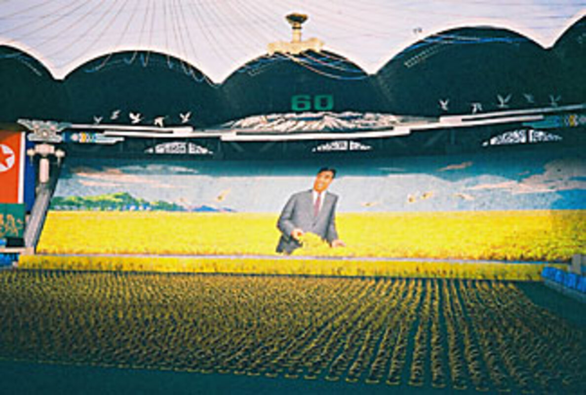 The show assumes more significance than usual this year. On either side of the stands, in lights, are the years 1948 and 2008: It's the 60th anniversary of the founding of the Democratic People's Republic of Korea, the North's formal name. The fact that Kim Jong Il did not attend the parade marking the event, even though he was present at the 50th anniversary, is a detail that goes unnoted, at least publicly.