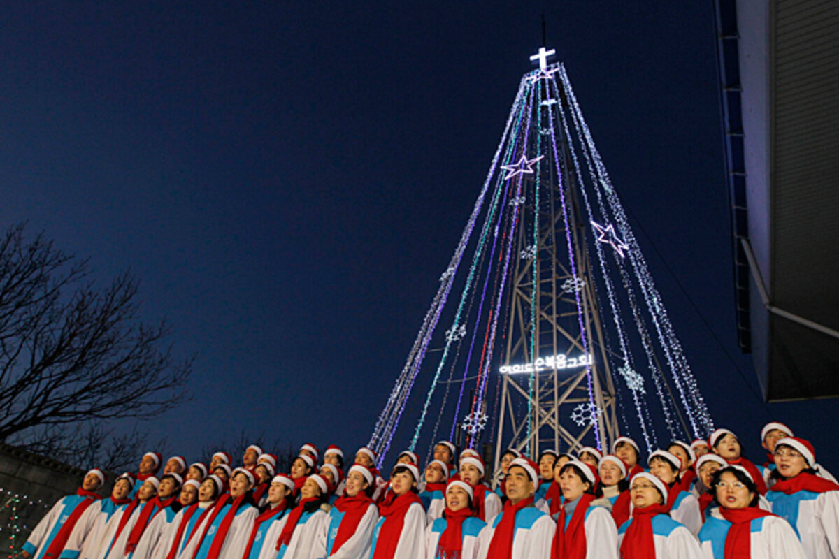 The lighting and maintenance of the tree is a project of the Full Gospel Church, an evangelical faith that draws well over 10,000 people to services that go on every hour or two each Sunday in the imposing central church near South Korea鈥檚 National Assembly building in Seoul. A church choir sang as the lights were turned on Tuesday night, and the image was on the front pages of Korean newspapers along with photographs of military exercises.
