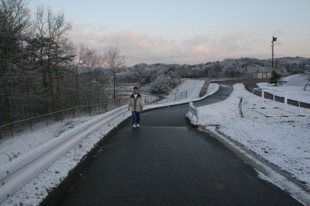 Mitsuo, the father, appears more despondent, sitting slightly apart from the rest of the family lost in thought, occasionally popping outside for a chat with other men grouped at the sports hall entrance, sheltering under a canopy from the snow.