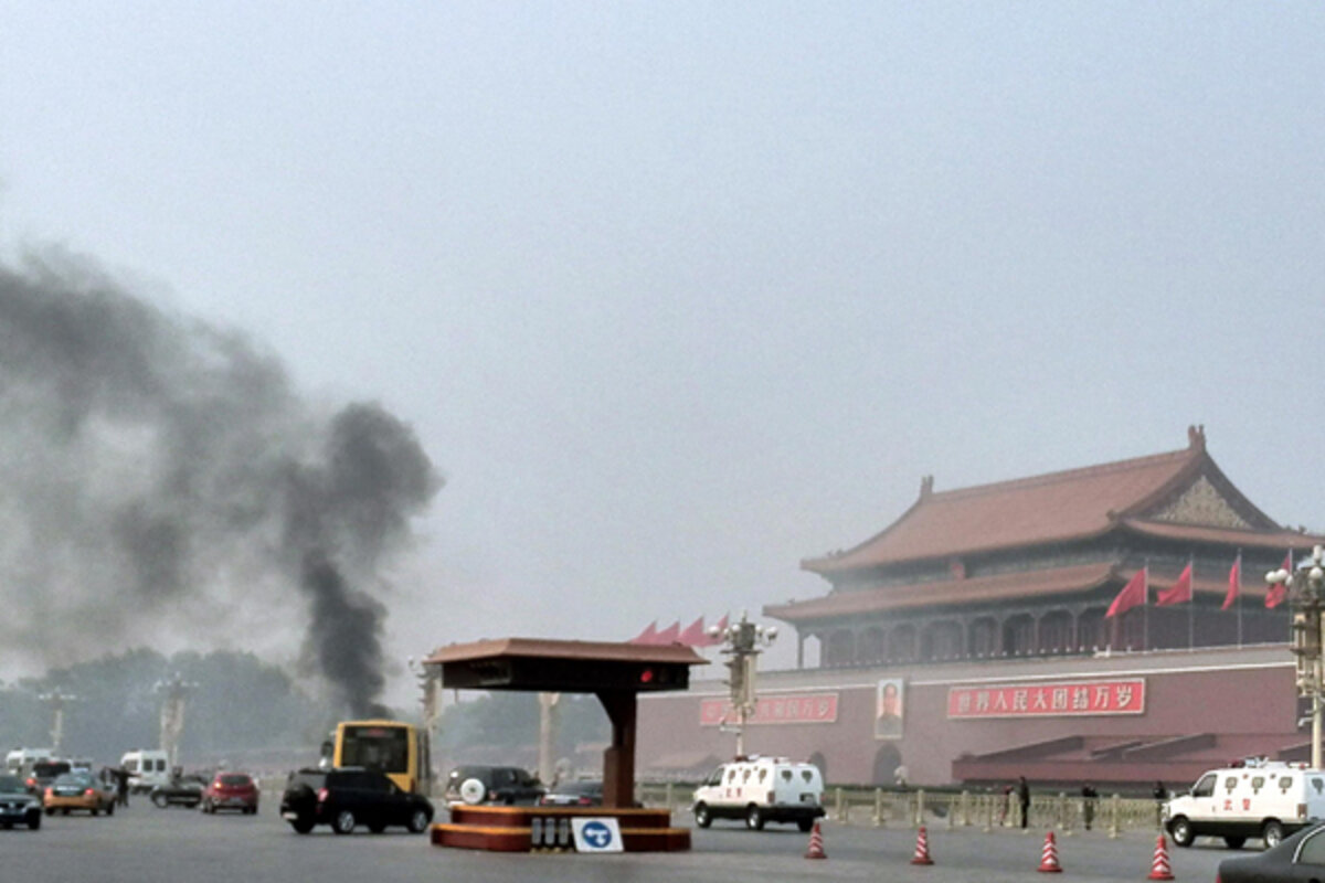 A sport utility vehicle plowed through crowds of tourists, then crashed and burst into flames in front of the Tiananmen Gate in central Beijing聽on Monday, killing the car's three occupants and two bystanders and injuring 38 others, police said.