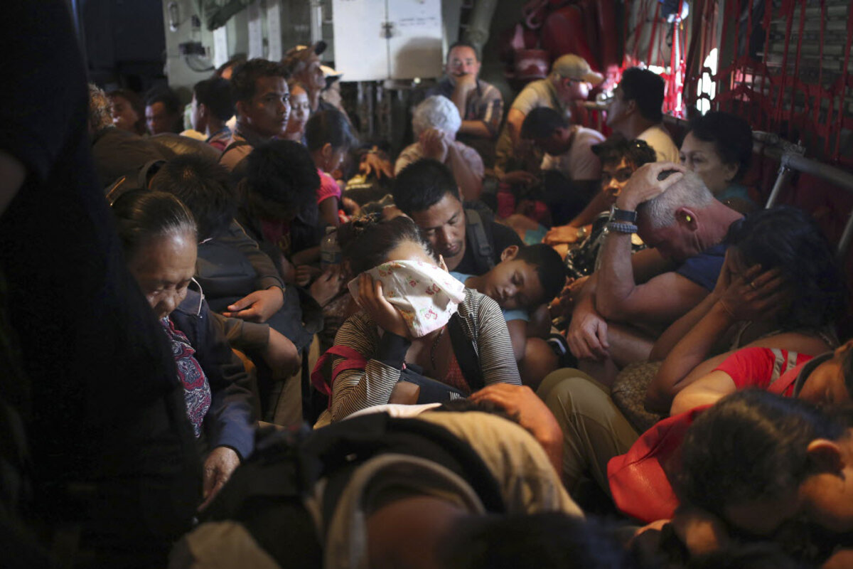 They have left a city destroyed, piling into jump seats and spreading out on the floors of the cavernous plane, straining with the takeoff to catch glimpses of their hometown through the small windows. For many, it is their first flight. Once airborne, they try to rest, what for many is the first sleep they have had in days.