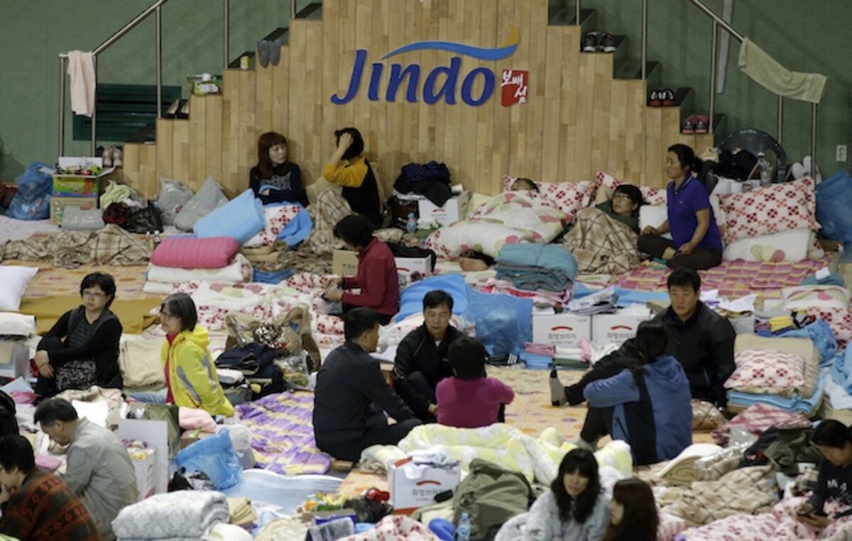 An atmosphere of stoicism and quiet calm pervades the floor of the spacious gymnasium in this pleasant seaside community as fathers and mothers, brothers and sisters, talk in low strained murmurs, lying on mats, wrapped in blankets, a week after the ferry, the Sewol, sank 12 miles south amid rocky islets visible聽to the horizon.聽