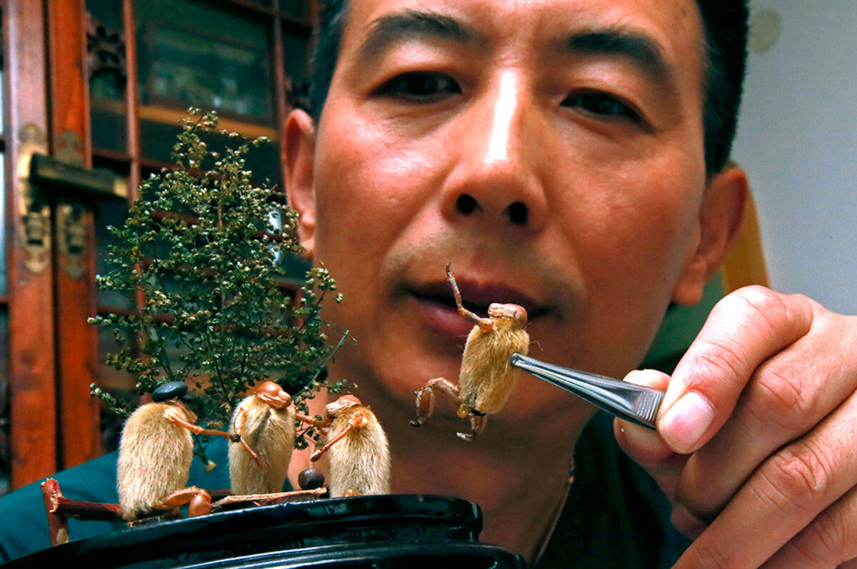 They do it by taking magnolia buds gathered in early spring, when they are covered with a fluffy down, and attaching the heads and legs of cicada carapaces 鈥 resembling minuscule lobster claws 鈥 which the insects shed in high summer and leave on the trunks of the trees in which they live.