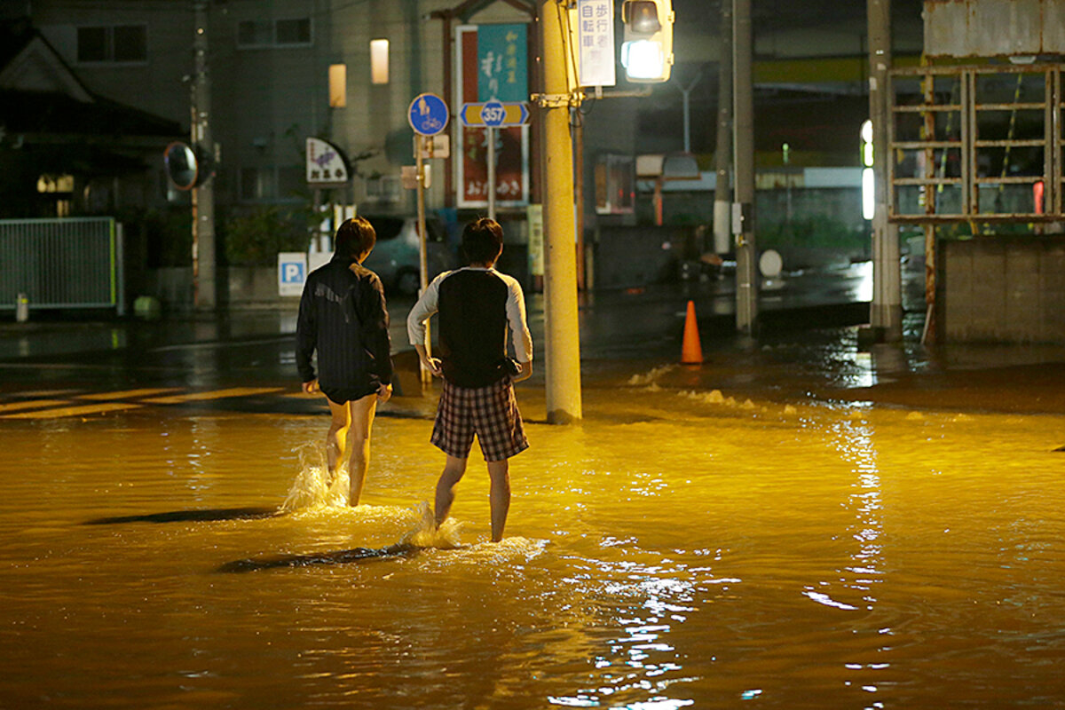 Aerial videos showed a wide swath of cityscape underwater, more than one story deep in some places. The rains came on the heels of聽Tropical聽Storm聽Etau, which caused flooding and landslides elsewhere Wednesday as it crossed central Japan.