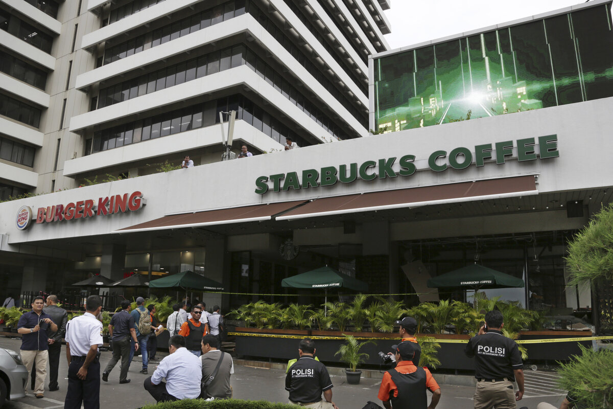 Jakarta police chief Maj. Gen. Tito Karnavian told a news conference that the first suicide bombing happened at a Starbucks restaurant, causing customers to run out. Outside, two gunmen opened fire, killing a Canadian and聽wounding an Indonesian, he said.