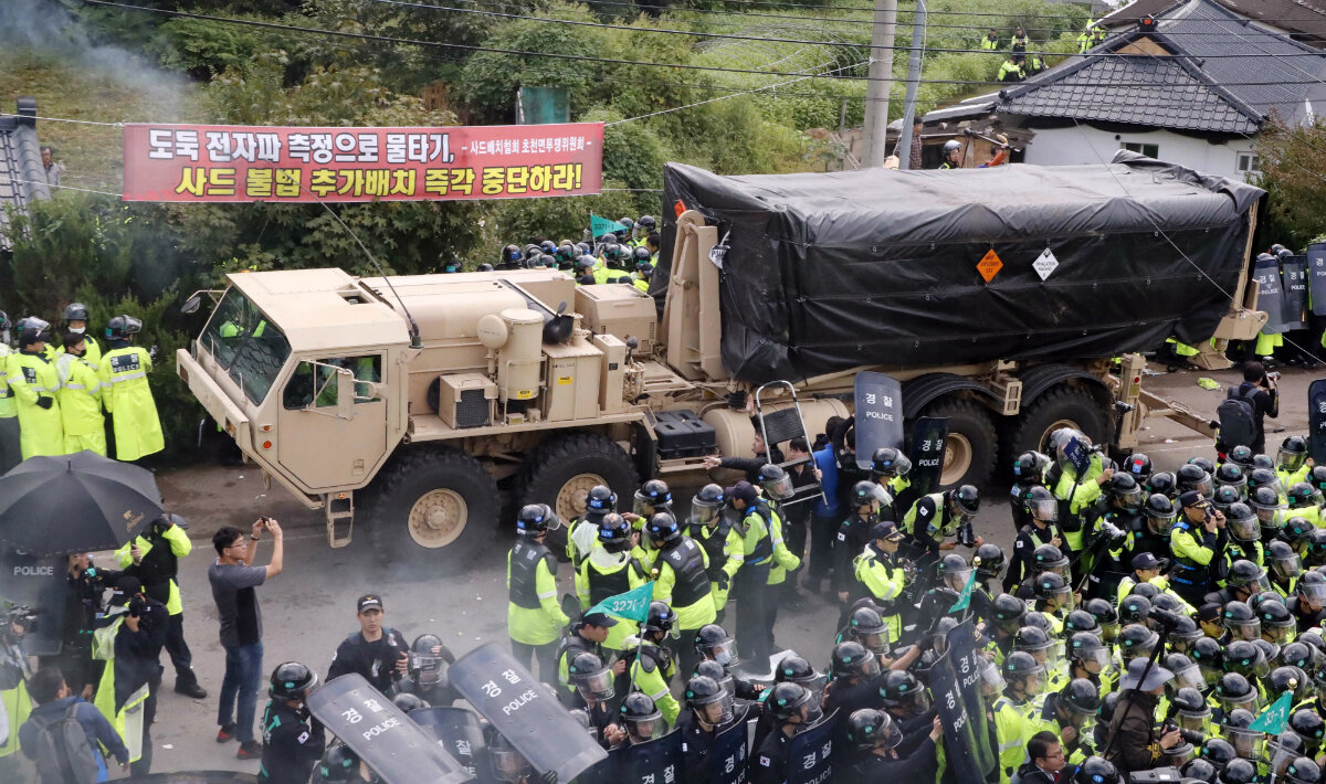 In the rural town of Seongju, thousands of police officers in riot gear swarmed some 400 protesters who since Wednesday night had been occupying a road leading to a former golf course where the Terminal High-Altitude Area Defense System (THAAD) is installed.