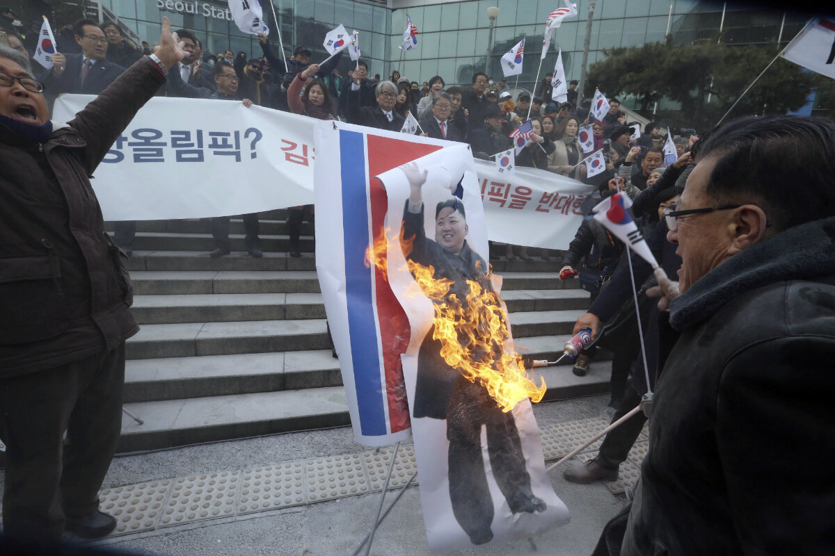 Conservative South Korean activists burned a large photo of North Korean leader Kim Jong-un as the head of the North's extremely popular girl band passed them Monday during a visit to Seoul amid a flurry of cooperation agreements between the rivals ahead of next month's Winter Olympics in the South.