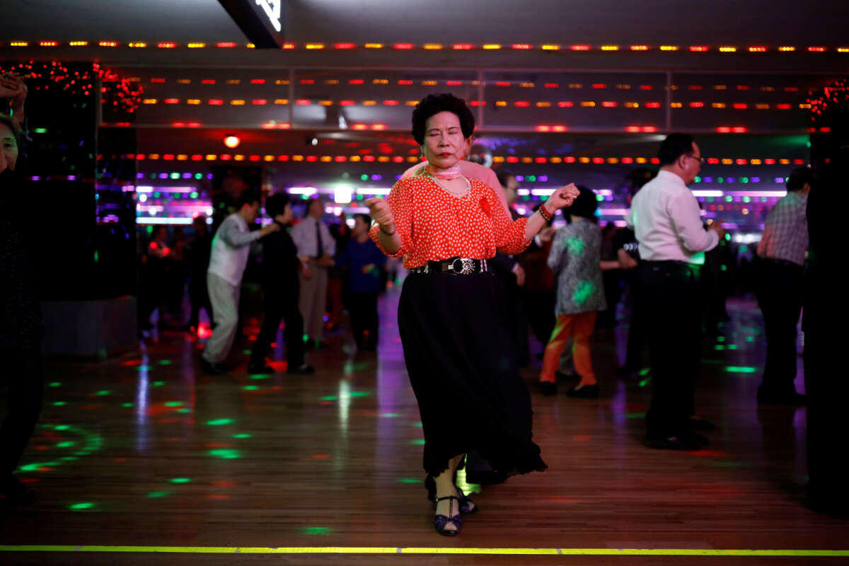 "What else would I do all day? My family is busy with work. I hate going to senior centers cause all they do there is smoking," said Mr. Kim, wearing a beret as he sat on a bench at the edge of a dance floor decorated with fairy lights and mirror balls.