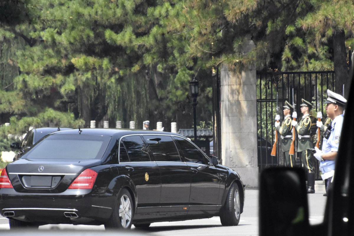 A motorcade including sedans, minibuses, motorcycles, and a stretch limo with a golden emblem similar to one Kim used previously was seen leaving the airport and later entering the Diaoyutai State Guesthouse, where senior Chinese officials meet with visiting leaders.