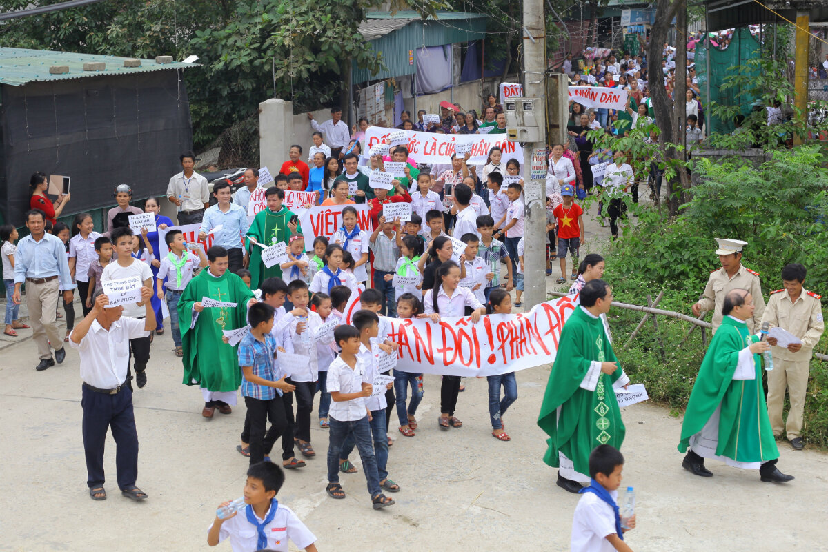 Security was tightened on Sunday to prevent protests in major cities, but thousands still gathered in central Ha Tinh province, many with signs saying "No leasing land to Chinese communists for even one day."
