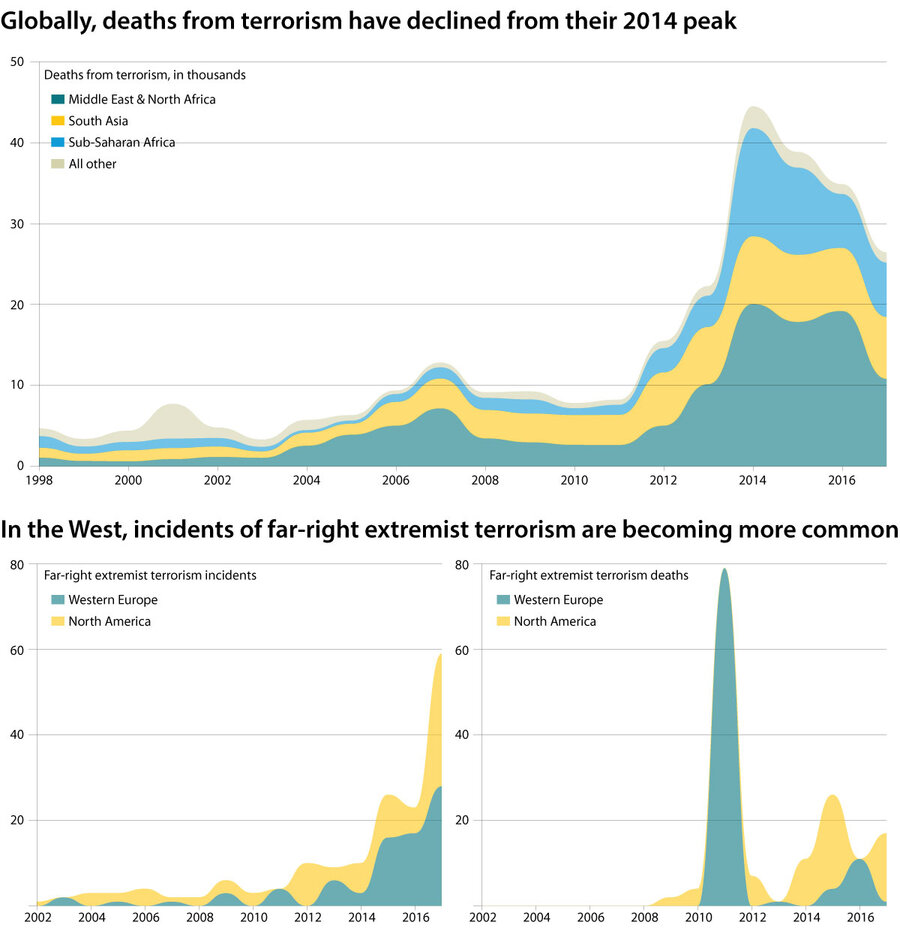 That focus has been warranted, as Islamist terrorists have been responsible for the vast majority of attacks and deaths since 2001. In 2017, four terrorist groups 鈥 Islamic State (ISIS), the Taliban, Al Shabab, and Boko Haram 鈥 were responsible for nearly 60 percent of the 18,800 deaths worldwide from terrorism, according to the Global Terrorism Index.